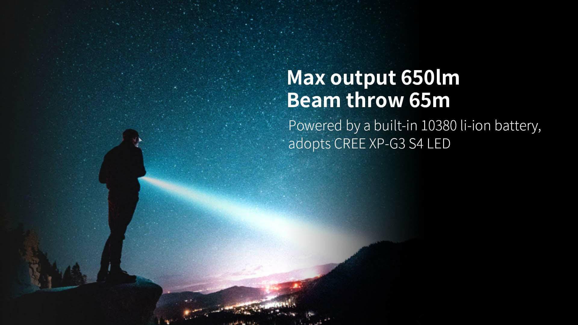 - Potencia máxima de 650 lúmenes con alcance de hasta 65 metros.