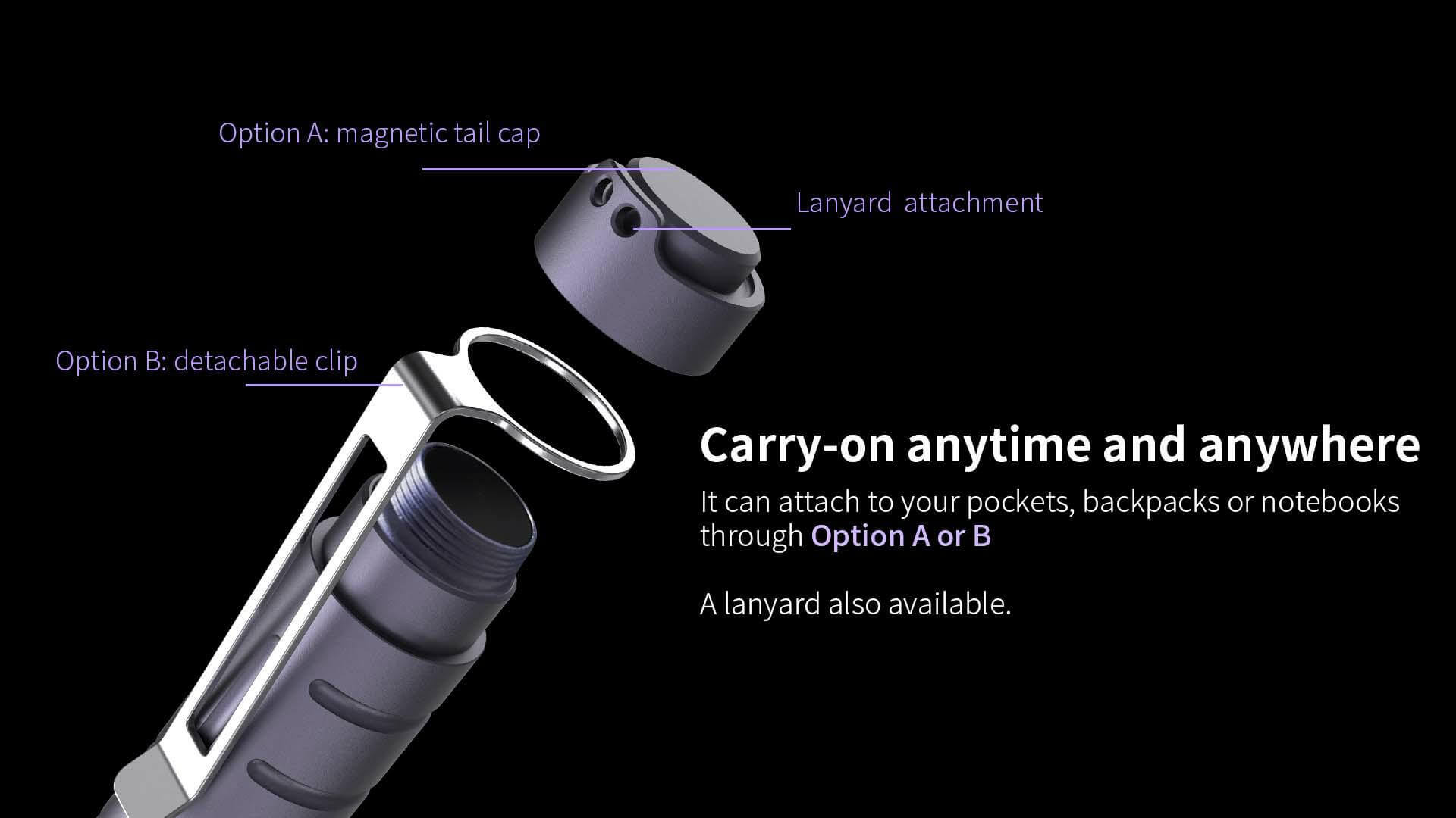 - Clip metálico desmontable para bolsillo o mochila.
